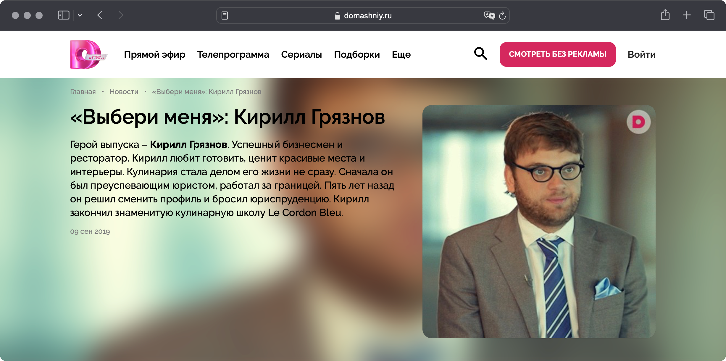 В 2015 году Грязнов снялся в первом сезоне шоу «Выбери меня» телеканала «Домашний», где одинокие мужчины каждую неделю выбирают невесту среди шести девушек. «Знакомьтесь: главный приз этой недели — Кирилл Грязнов, успешный бизнесмен и ресторатор. У него есть все, кроме любимой женщины» — так представляли его в первом выпуске передачи, заявляя, что Грязнов намерен открыть «минимум» три ресторана, в том числе в Москва-Сити.