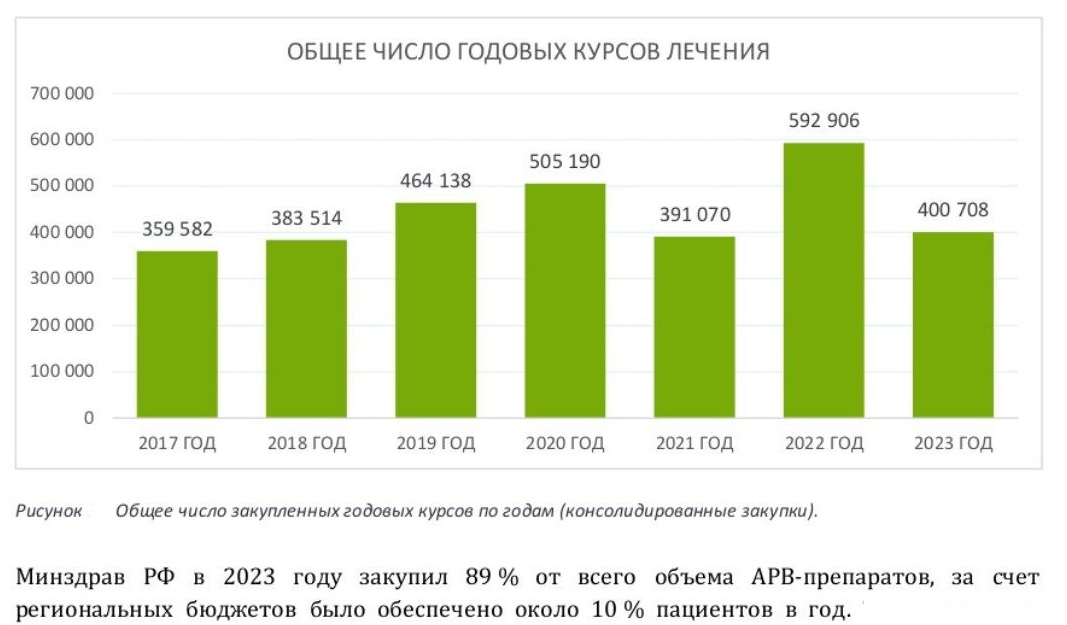 Мнение эксперта подтверждает отчет группы "Здравресурс" о закупках АРВТ в 2023 году в РФ (вошли также данные с сайта "Перебои.ру"), согласно которому на второй год войны бюджет на закупку антиретровирусных препаратов уменьшился почти на треть (в сравнении с 2022 годом).