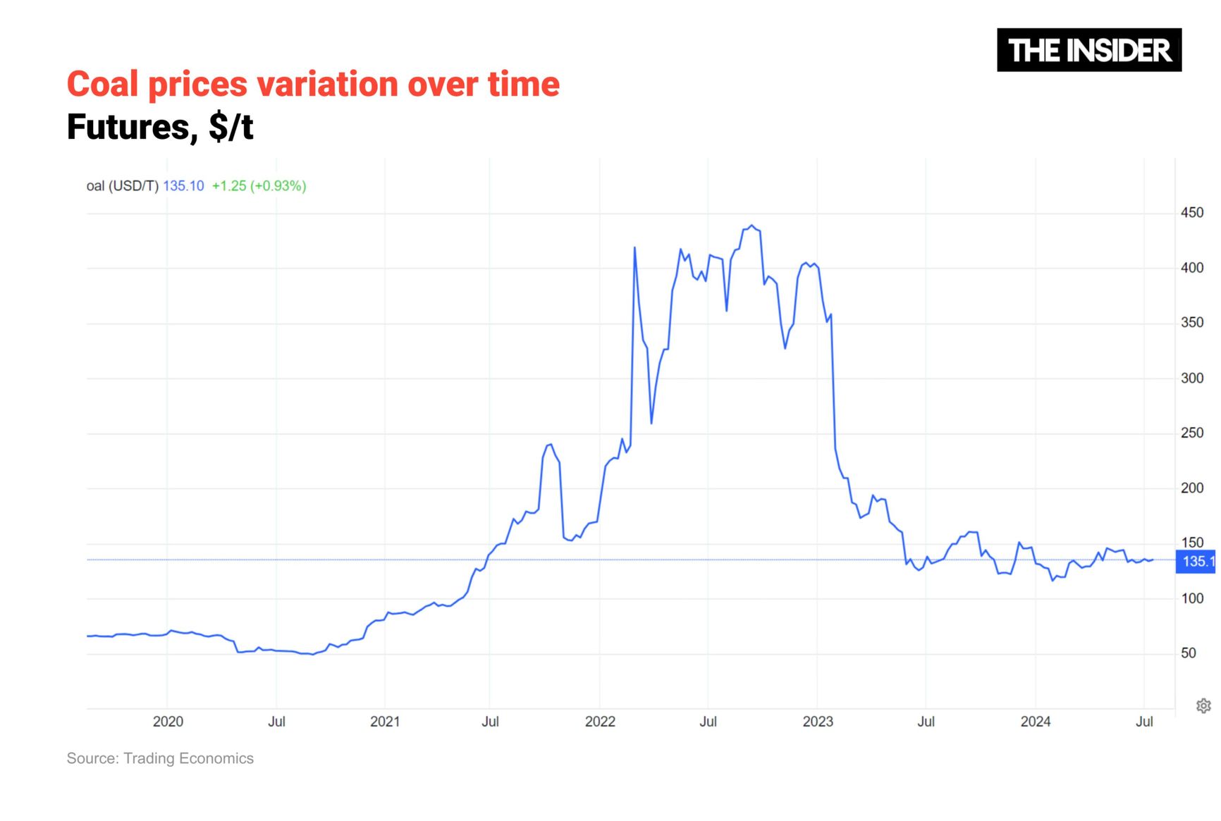 Global demand is keeping coal prices above pre-war levels, although prices dropped to $133 per ton in mid-July 2024 after reaching energy crisis peaks of $327-437 per ton in May-December 2022.