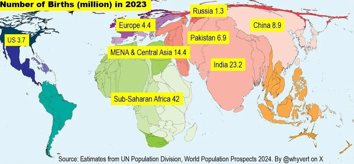 Тот же Ракша приводит данные ООН по числу рождений за 2023 год. Показатель России тут один из самых низких — 1,3 миллиона.