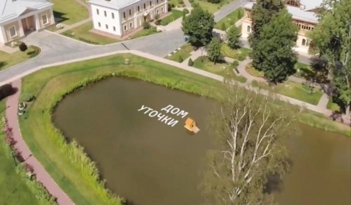 Знаменитый дом для уточки был обнаружен в пруду напротив «дачи», исторической усадьбы «Миловка», на берегу Волги в 3 км от туристического города Плёса. Двухэтажная усадьба построена в 1775 году, но находится в хорошем состоянии благодаря реставрации, которая по оценке ФБК обошлась в 25 – 30 млрд рублей.