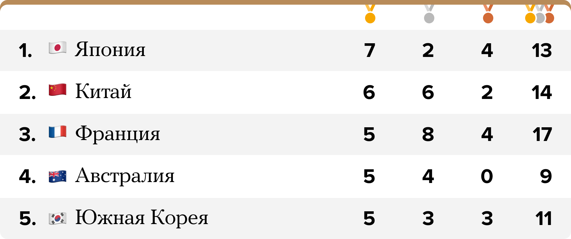 В лидеры медального зачета к середине четвертого соревновательного дня вышла сборная Японии — благодаря во многом неожиданной победе в командном многоборье в мужской спортивной гимнастике, а также очередному (уже третьему) золоту в дзюдо. США лидируют по общему числу медалей (20), но у них лишь три золотых, поэтому американцы не входят в первую пятерку. Данные в таблице приведены по состоянию на 19:30 мск 30 июля.