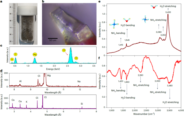 Вода и аммоний в образце проявляются в виде гидратированного минерала с формулой (NH4, K, Cs, Rb) MgCl3–6H2O. Молекулярная формула минерала включает целых шесть молекул кристаллизационной воды, при этом они составляют до 41% образца по массе. Характерные пики от молекул воды и аммония четко обнаруживаются в спектрах.