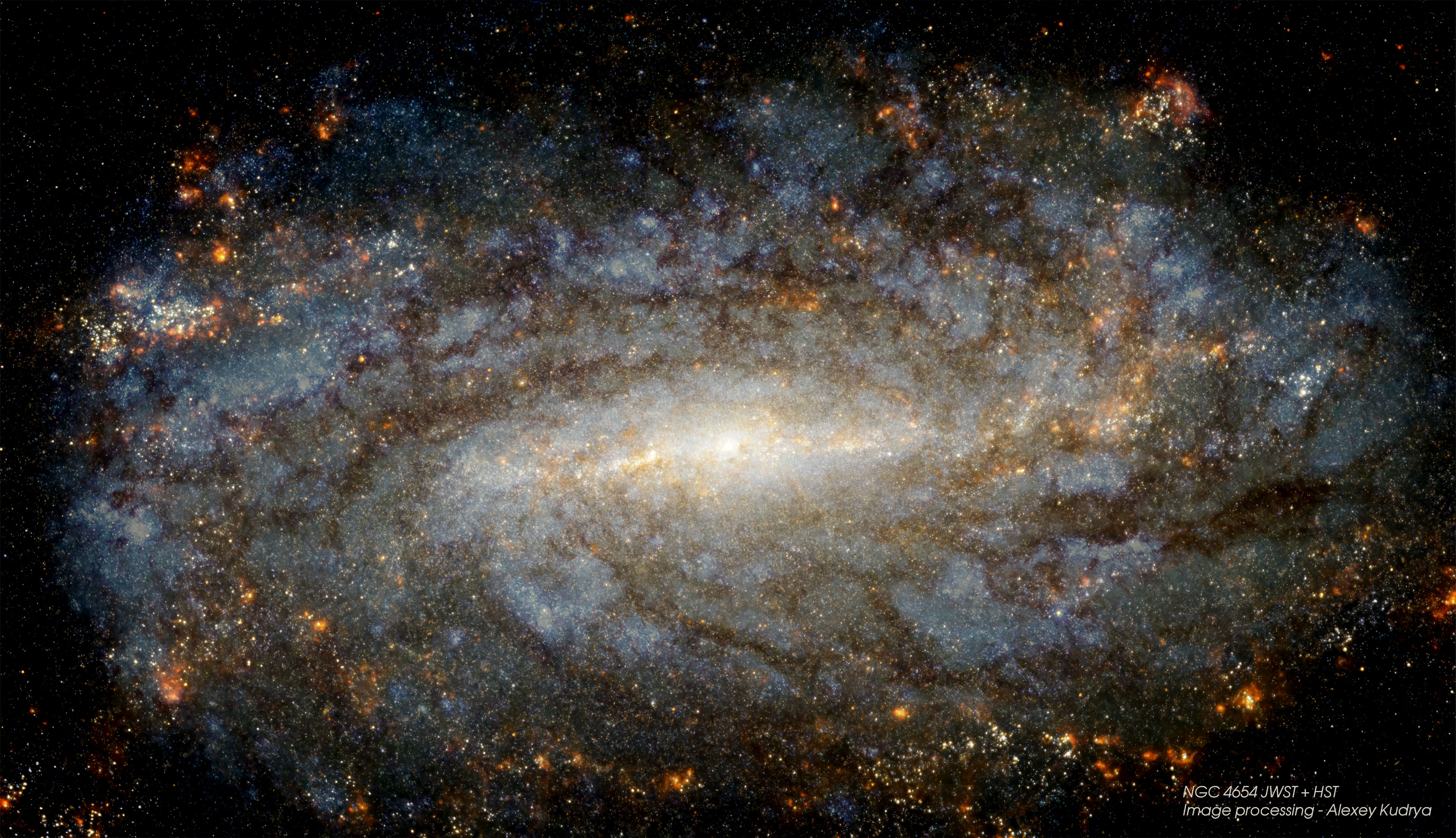 NGC 4654 — одна из многих галактик скопления Девы с неравномерным распределением звезд и нейтрального водорода. Астрономы полагают, что в NGC 4654 происходит истечение газа, при котором гравитационное притяжение скопления галактик воздействует на межзвездный газ внутри галактики.