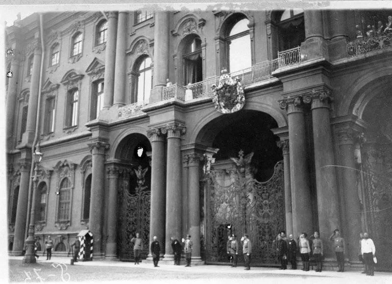 Их величества прибыли в Петербург (из Петергофа. — П.Г.) морем. Они шли пешком от катера до дворца, окруженные народом. Мы еле добрались до места: по лестницам, в залах, везде толпы офицерства и разные лица. Нельзя себе вообразить, что делалось во время выхода их величеств. В Николаевском зале был отслужен молебен, после которого государь обратился ко всем присутствующим с речью. В голосе его сначала были дрожащие нотки волнения, но потом он стал говорить уверенно и с воодушевлением. Завершил речь словами: «Не кончим войну, пока не изгоним последнего немца из пределов русской земли!» Ответом на эти слова было оглушительное «Ура!», стоны восторга и любви; военные окружили государя толпой, махали фуражками, кричали так, что, казалось, дрожат стены и окна. Я почему-то плакала, стоя у двери залы. Их величества медленно продвигались обратно, и толпа, невзирая на придворный этикет, кинулась к ним; дамы и военные целовали их руки, плечи, платье государыни.