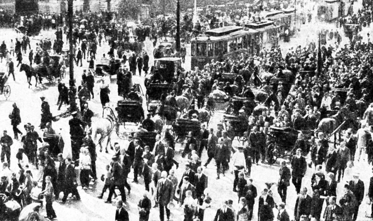 Москва встретила царский манифест о войне массовыми демонстрациями и митингами, продолжавшимися всю ночь. В час ночи толпа подошла к дому градоначальника и потребовала снять все вывески на немецком языке и рассчитать всех германских подданных на предприятиях.