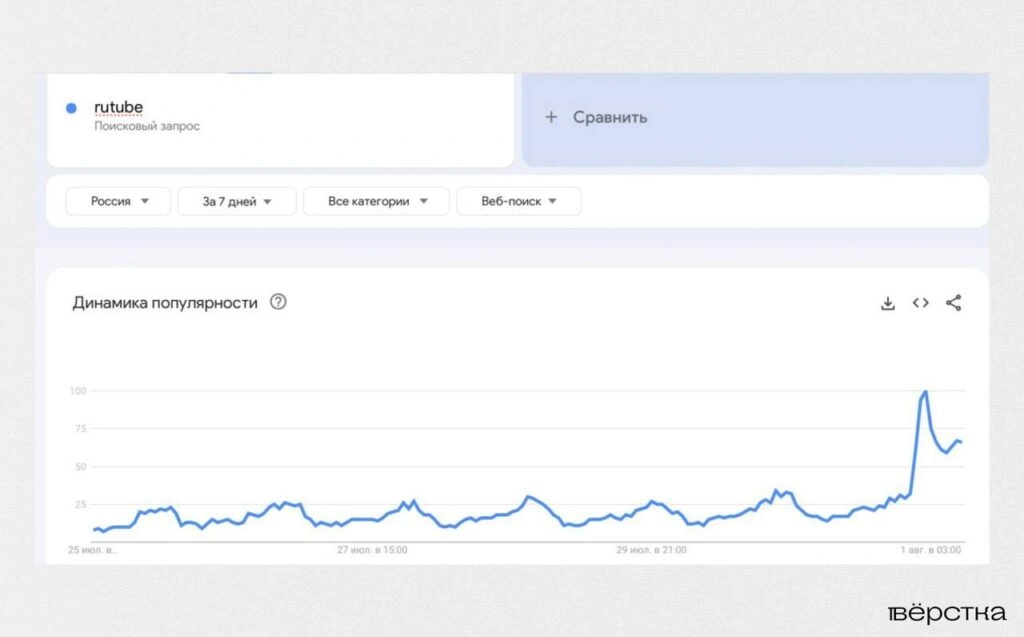 Также выросло, но не столь значительно, число запросов о российском видеохостинге в вариации «рутуб»: ночью 1 августа этот показатель достиг 100 баллов, но 28 июля он уже поднимался до значения в 88 баллов.