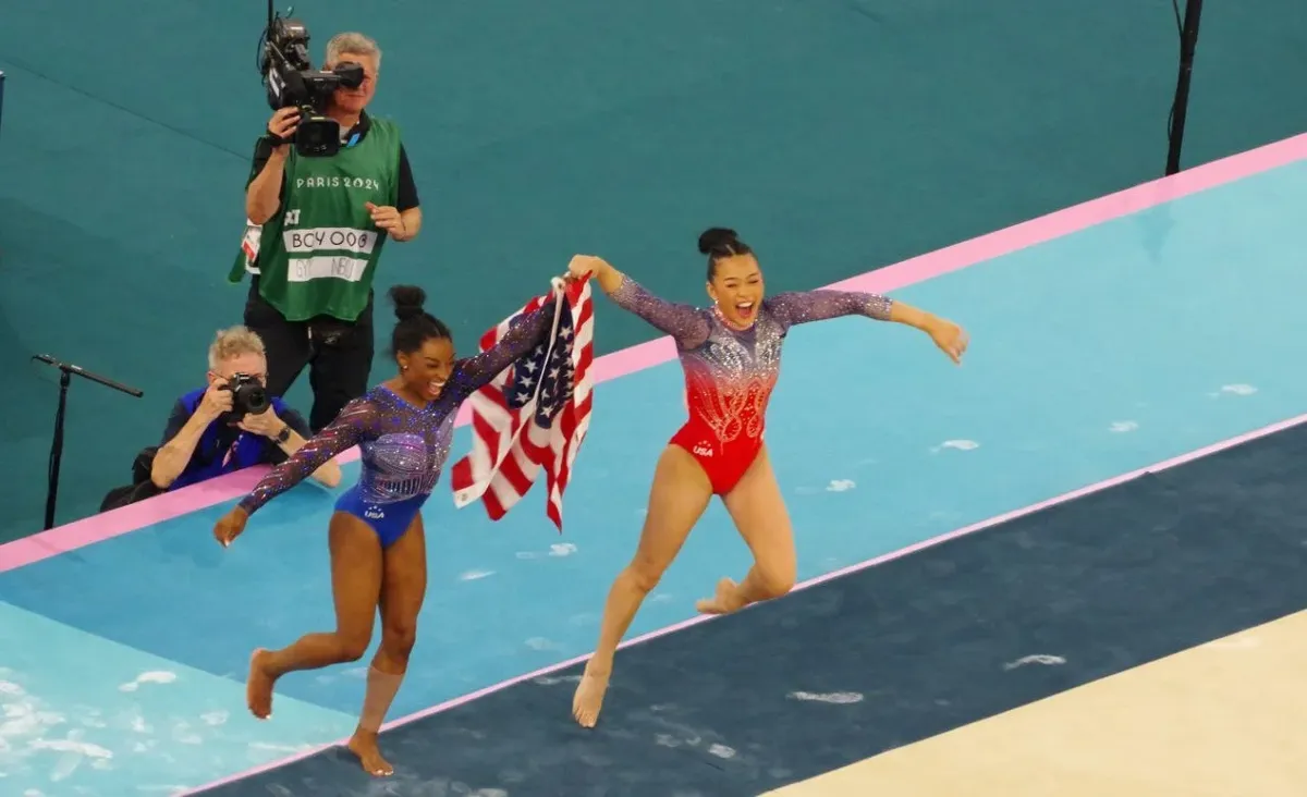 Суниса, заключившая к тому моменту в объятия Симону Байлз, в радостном прыжке взмыла в воздух — вместе с главной героиней этого «кино» и американским флагом. Ребека Андраде в этот же момент, не менее радостная, побежала исполнять короткую самбу с бразильским флагом в другом углу зала.