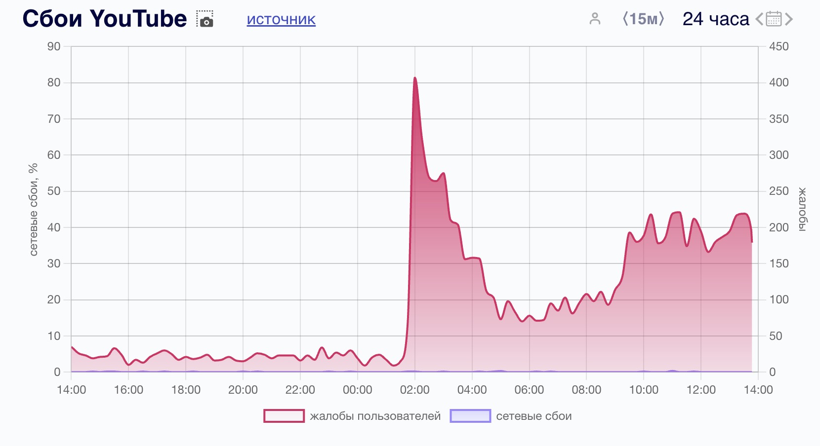 Со вчерашнего дня, 1 августа, российские пользователи ютьюба массово сталкиваются с перебоями в работе сервиса: видео загружаются медленно или не загружаются совсем. За сутки портал "Сбой.рф" зафиксировал более 14 тысяч жалоб, больше всего – из Москвы, Петербурга и Краснодарского края.