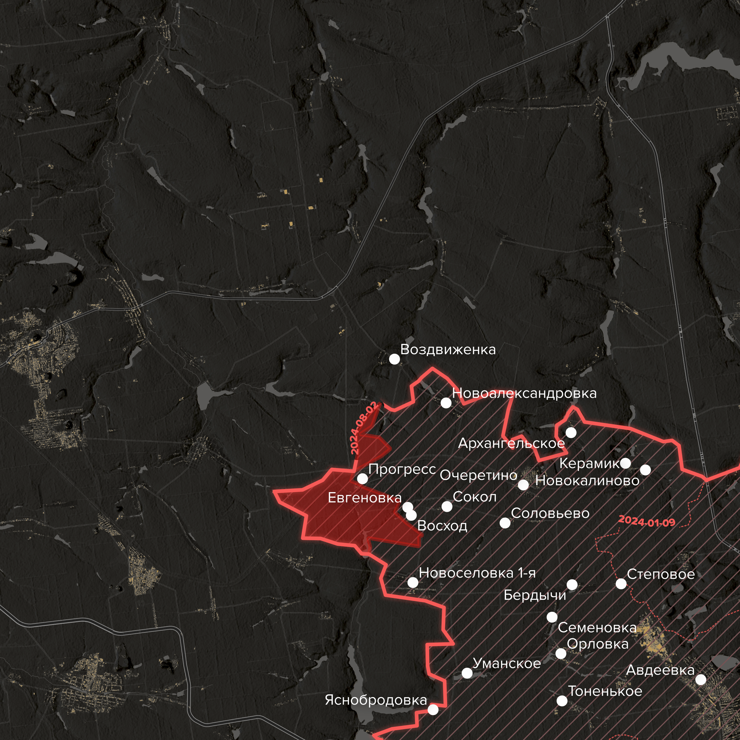 - После захвата села Прогресс ВС РФ продвинулись дальше вдоль железной дороги Очеретино — Покровск, а также к северу и югу от нее. Видео, снятые дронами с обеих сторон, показывают, что российские войска, отбив небольшие танковые контратаки ВСУ, вышли к селам Веселое, Желанное и Тимофеевка. Было захвачено и село Волчье к югу от Прогресса.