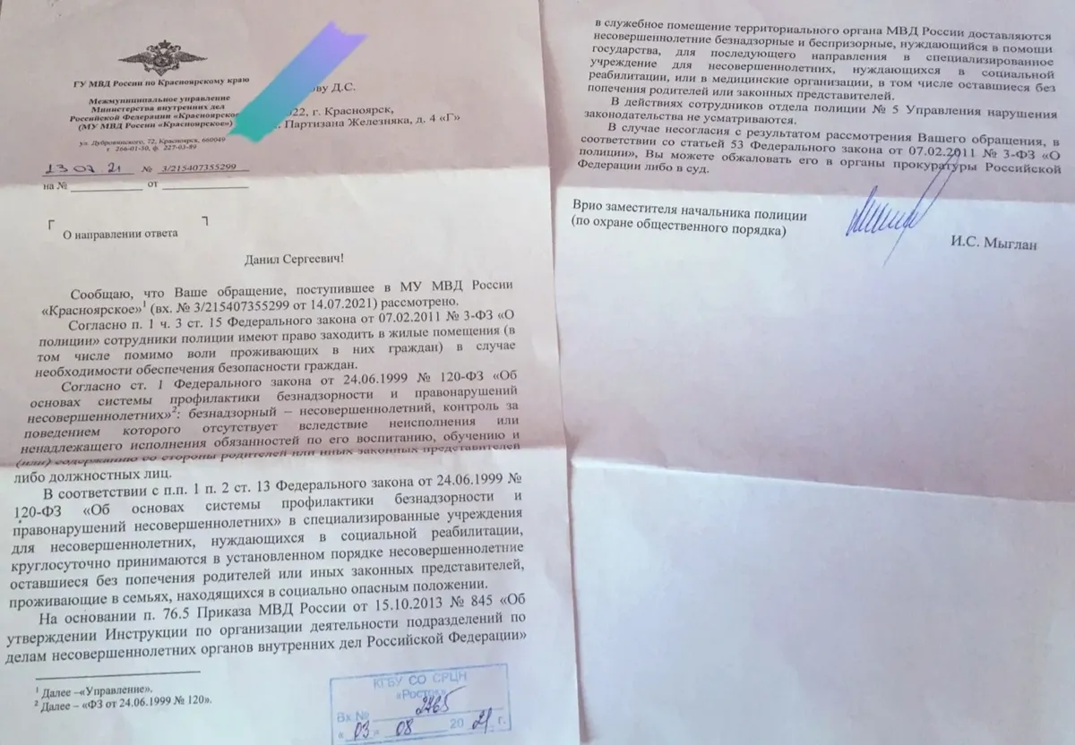 А вот официальный ответ, данный другим полицейским начальником по фамилии Мыглан, на обращение Данила, тогда еще 16-летнего, которого в том же Советском районе Красноярска доблестные сотрудницы ПДН вместе с примкнувшими к ним полицейскими вытащили из дома и, угрожая надеть наручники, увели в приют «Росток» за злостное непосещение школы (видимо, там он, согласно замыслу силовиков, должен был начать учиться — но не тут-то было: проведя в приюте почти 10 месяцев, Данил так же не ходил в школу и остался в 9-м классе на третий год; несмотря на несогласие отдела опеки и тогдашней замглавы Советского района Береговой, суд постановил вернуть его родной матери; недавно Данил окончил 11 классов и сдал ЕГЭ).