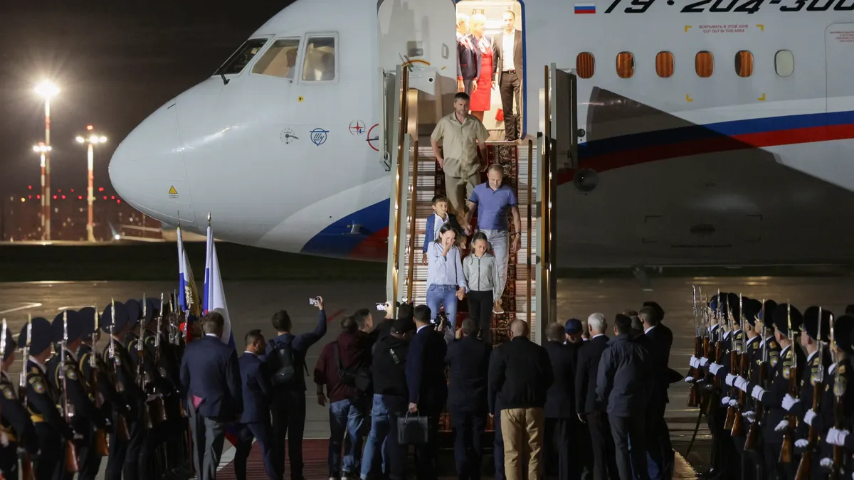 Eight Russian citizens released in the Russian-US prisoner swap arrive at Moscow’s Vnukovo Airport, 1 August 2024. Photo: EPA-EFE / GAVRIIL GRIGOROV