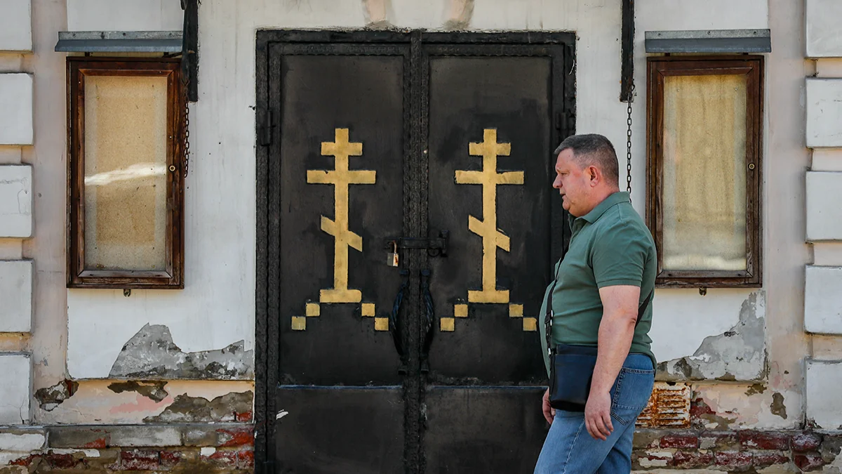 Мужчина проходит перед крестами на дверях православной церкви в Москве, Россия, 11 июля 2024 года. Фото: Юрий Кочетков / EPA-EFE