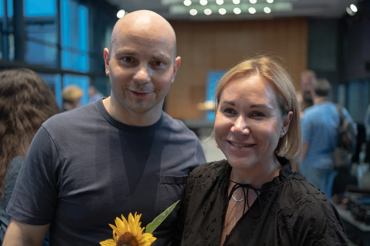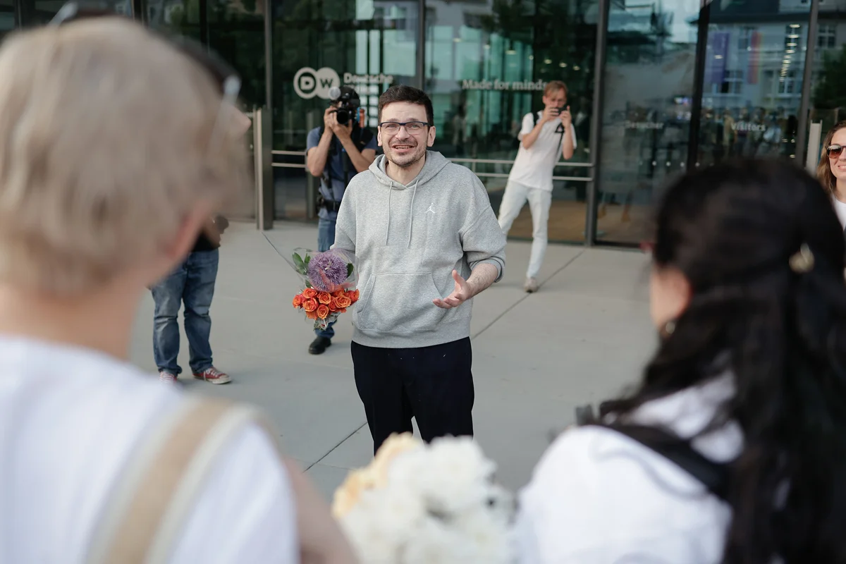 Формально пресс-конференция закончилась, но всех спикеров облепили репортеры и просто сочувствующие. Кевин Лик с кем-то обнимается, Пивоваров и Усманова наконец встретились, разговаривают. Кара-Мурзе дарят подсолнухи. Все счастливы. И вот первым выйти на улицу собирается Илья Яшин. Я подхожу к нему прямо у выхода и спрашиваю, что он ощущал накануне освобождения и знал ли, что его ждут в аэропорту. Он отвечает: