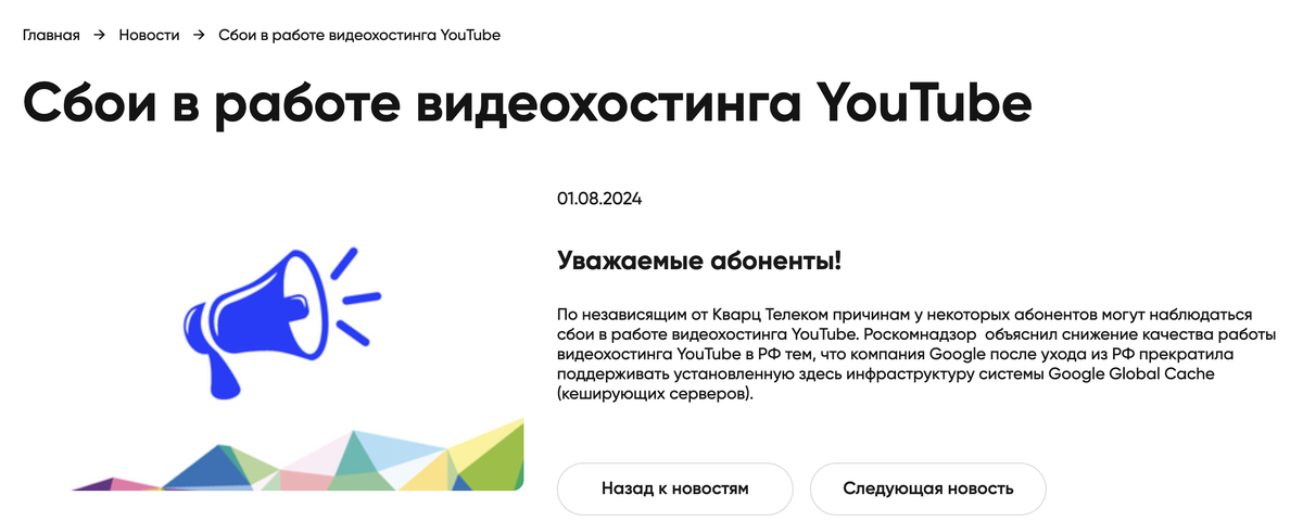 Еще одно сообщение о замедлении YouTube было опубликовано на сайте провайдера «Кварц Телеком» 1 августа. В нем снижение качества работы YouTube объяснили проблемами с Google Global Cache.