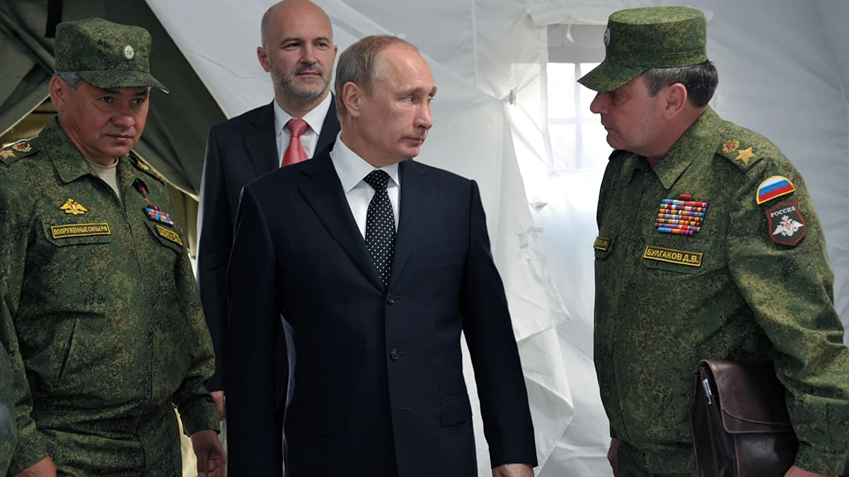 Владимир Путин, Дмитрий Булгаков, Сергей Шойгу и Константин Ильковский принимают участие в наблюдательной операции подразделений Центрального и Восточного военных округов на полигоне Цугол Восточного военного округа, 17 июля 2013 года. Фото: Алексей Никольский / EPA-EFE