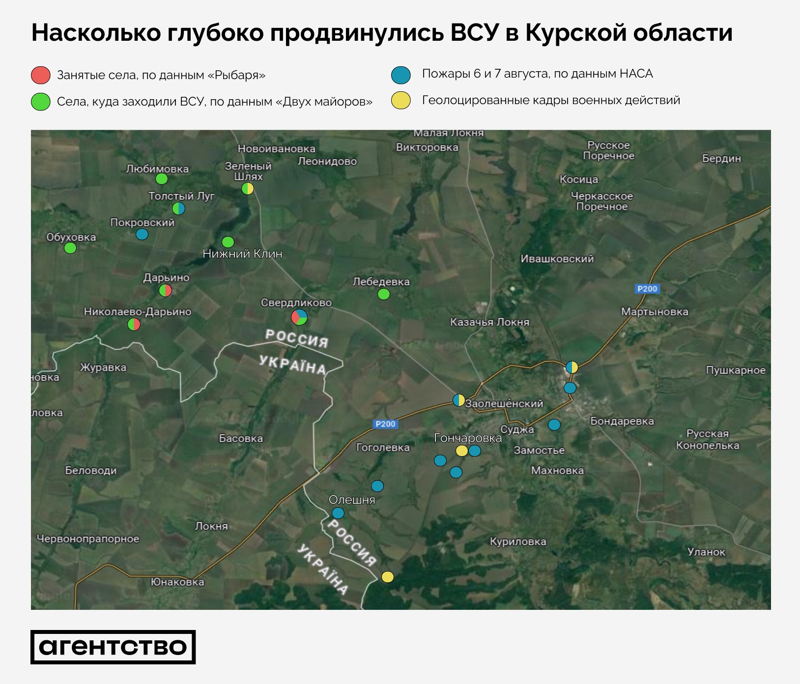 - Согласно этим данным, самая дальняя от границы точка, где стороны несли потери в военной технике, — северо-восток города Суджа, примерно в 11 км от границы. Здесь был уничтожен грузовик. Примерно на этом же расстоянии от границы (9,2 км) находится село Любимовка, в котором, как писал канал «Два майора», присутствовали украинские войска.
