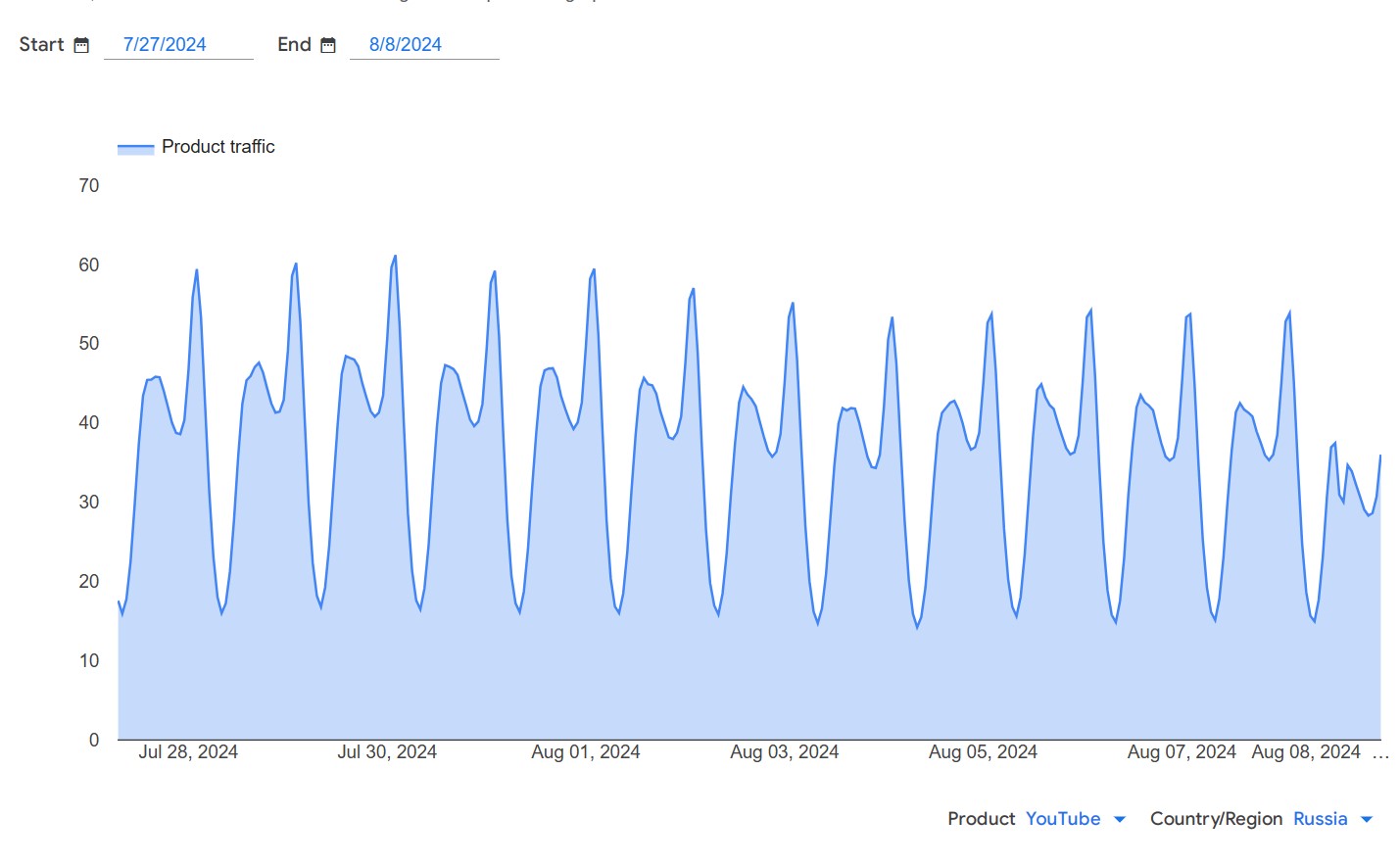 Детали. Динамика YouTube 8 августа существенно отличалась от всех предыдущих дней — на графике, который обнародовал Google, отсутствуют дневной и ночной пики посещаемости. Это первый случай, когда заметно падения трафика видеохостинга с момента начала его замедления российскими властями, подтвердил «Агентству» Климарев.