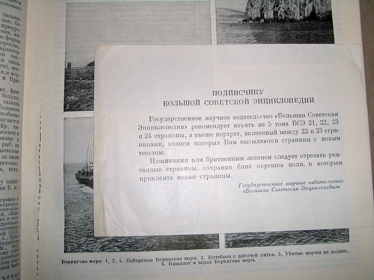 Но если запрет «за что угодно» — дело, в общем, привычное, то гораздо более интересны случаи, когда под цензуру мог попасть кто угодно. Например, сам Берия, который был арестован в 1953 году, — почти одновременно с этим вышел том «Большой советской энциклопедии», в котором была напечатана большая биографическая статья. Понятное дело, что после ареста такую статью пропускать было нельзя, но книга уже отпечаталась и разошлась — тогда во все библиотеки и всем подписчикам энциклопедии разослали указание: вырвать лист с Берией и вклеить другой, присланный на замену.