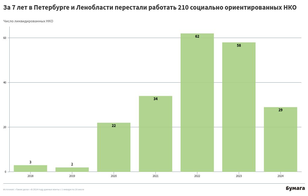 По данным «Таких дел», с 2007 года в Петербурге и Ленобласти закрылось 213 социально ориентированных НКО. Сейчас в Петербурге и Ленобласти работает 3165 некоммерческих организаций.