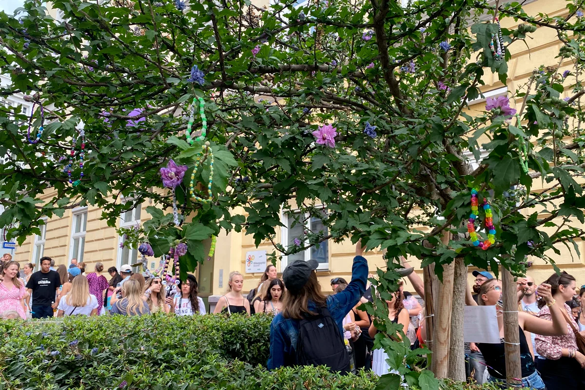 По периметру постоянно ходят несколько десятков девушек с карабинами, на которых закреплены те самые браслеты: «Тут бисера почти на килограмм», — говорит одна из них в самой простой повседневной одежде и с парой браслетов на руках. Это Лина, журналистка из Вены, ей 28 лет и она давно следит за политической повесткой, поэтому с пониманием относится к отмене, но осознает, что для многих это стало шоком: