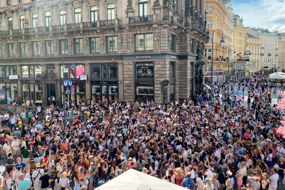 В четверг утром центральные улицы Вены заполонили тысячи нарядных людей: некоторые девушки были в блестящих платьях и с ярким макияжем, другие — в розовых ковбойских шляпах и казаках. Рядом с ними стояли мужчины с футболках с надписями I love Taylor Swift, многие из взрослых были с детьми. Этих людей никто не собирал: почти все они пришли на главную туристическую улицу Вены, потому что увидели в соцсетях, что там встречаются поклонники Тейлор Свифт. Здесь они вместе поют хиты певицы, потому что попасть на концерты, билеты на которые они купили больше года назад, они не смогут: накануне их отменили из-за подготовки теракта на местном стадионе.