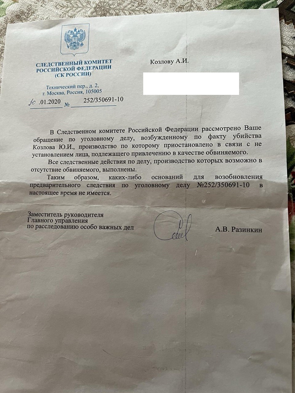 В 2020 году, когда Вадим Красиков уже находился в немецкой тюрьме, Александр Козлов получил очередной ответ из Следственного комитета России. Из него следовало, что уголовное дело по факту убийства его брата "приостановлено в связи с неустановлением лица, подлежащего привлечению в качестве обвиняемого".