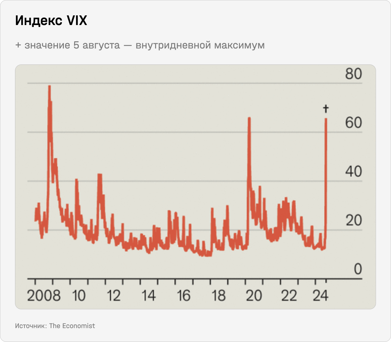 Насколько экстраординарными были события на рынках в начале недели, хорошо видно на графике VIX. Этот «индекс страха» на основе цен опционов показывает ожидаемую в ближайшие 30 дней волатильность на американском фондовом рынке. Индекс в этот день превысил 60 пунктов — такой уровень он достигал только во время мирового финансового кризиса.