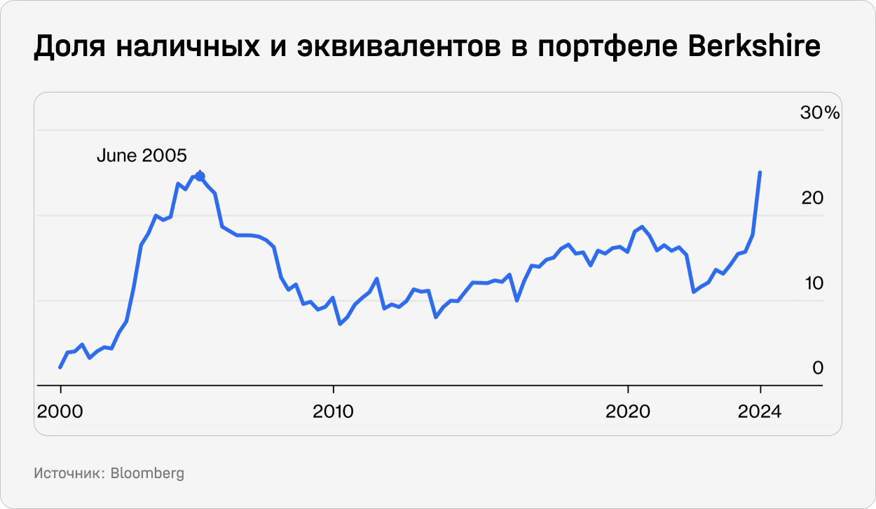 - продажа Berkshire Hathaway большого числа акций Bank of America и Apple: это, по мнению участников рынка, может говорить о том, что Уоррен Баффетт ждет его падения. В результате доля наличных в портфеле Berkshire превысила даже показатели 2005 года;