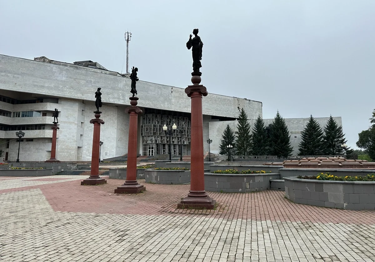Мы идем к филармонии, где Павел работал последние полтора года. Кожушков восхищается серым «рубленым» зданием с металлическими фигурками и барельефом на фасаде, построенным в 70-е «по особому проекту», и с гордостью заявляет: похоже на рояль.