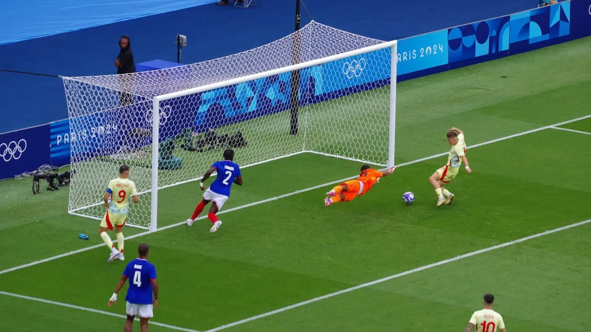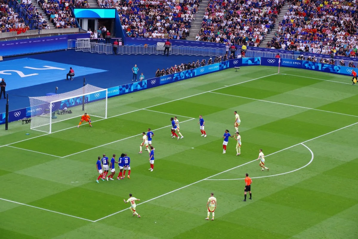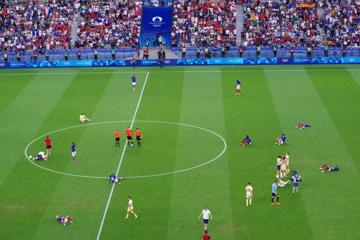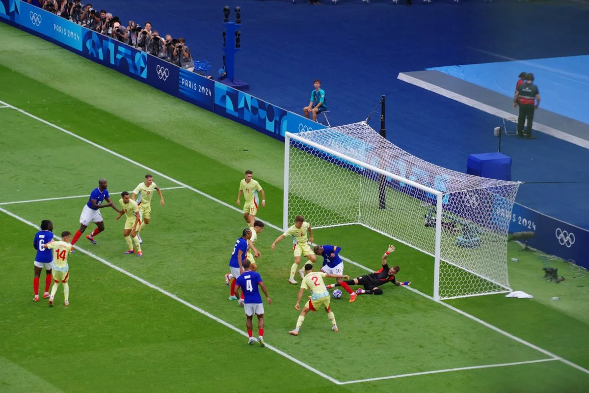 А началось все с 11-й, когда французы вышли вперед: Энзо Мийо с правого угла штрафной резаным ударом левой положил мяч в правый от вратаря угол ворот. Ликование французов, впрочем, было совсем коротким. Испанцы быстренько сравняли счет и вышли вперед (дубль барселонца Фермина Лопеса — сначала ударом в одно касание с центра штрафной, а затем замыканием у линии ворот флангового прострела), а к 28-й минуте, когда еще один чемпион Европы-2024 Алекс Баэна со штрафного красиво закрутил мяч над «стенкой» в ближний угол, счет стал уже пугающим для французских фанатов — 1:3.