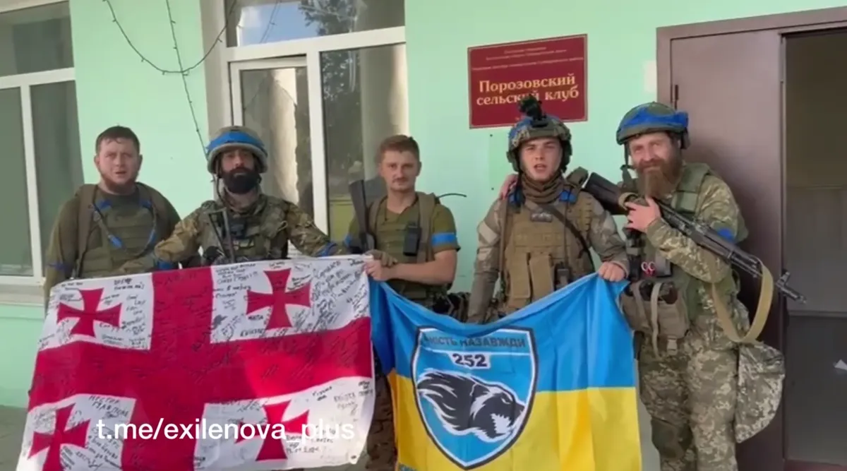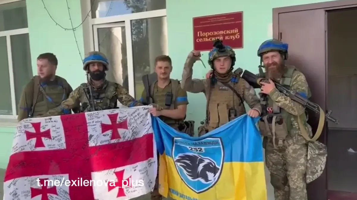 In the footage, which potentially represents an embarrassing fresh breach of Russia’s state border by the Armed Forces of Ukraine’s (AFU), five men in military uniform holding a Ukrainian and a Georgian flag can be seen in front of what appears to be the Poroz Farmers’ Club. One of the men introduces the group as soldiers from the AFU’s 252nd Territorial Defence Battalion.