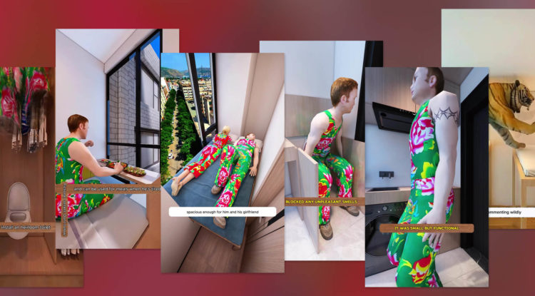 Закадровый голос, созданный при помощи нейросети, под ритмичную музыку озвучивает каждый шаг: сначала нужно расширить пространство, используя «арендованный квадратный метр», затем установить каркас кровати из оцинкованной стали (galvanized square steel) покрыть его экологичными деревянными пластинами — крепкими и долговечными. Вещи можно хранить в специальных отсеках под и над кроватью. А одежду на вешалках — повесить у окна и использовать как шторы. Рядом с кроватью следует установить унитаз, а над ним душ, чтобы можно было расслабиться после долгого рабочего дня. После этого в помещении удается разместить проектор для просмотра кино и рабочий стол, за которым Джон сможет усердно работать, чтобы накопить на жилье вдвое больше.