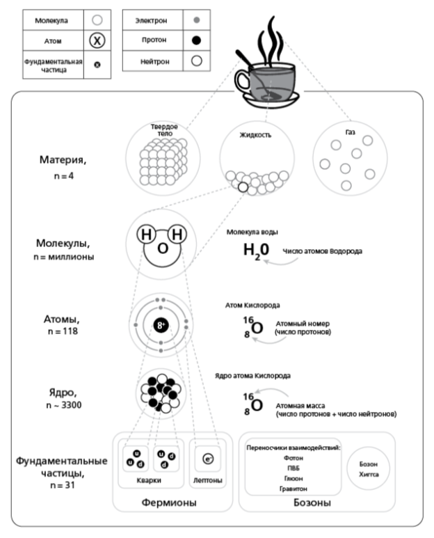 Что касается строения всего и вся в известной нам Вселенной, то дело обстоит примерно так, как на приведенном ниже рисунке. Чашка кофе содержит в себе опции и твердого тела, и жидкости, и газа (разве что плазменного состояния, при котором атомы разрываются на части, к счастью, в чашке кофе нет). Все они состоят из молекул, состоящих из атомов, которые, в свою очередь, состоят из более фундаментальных частиц (о них мы рассказывали выше).