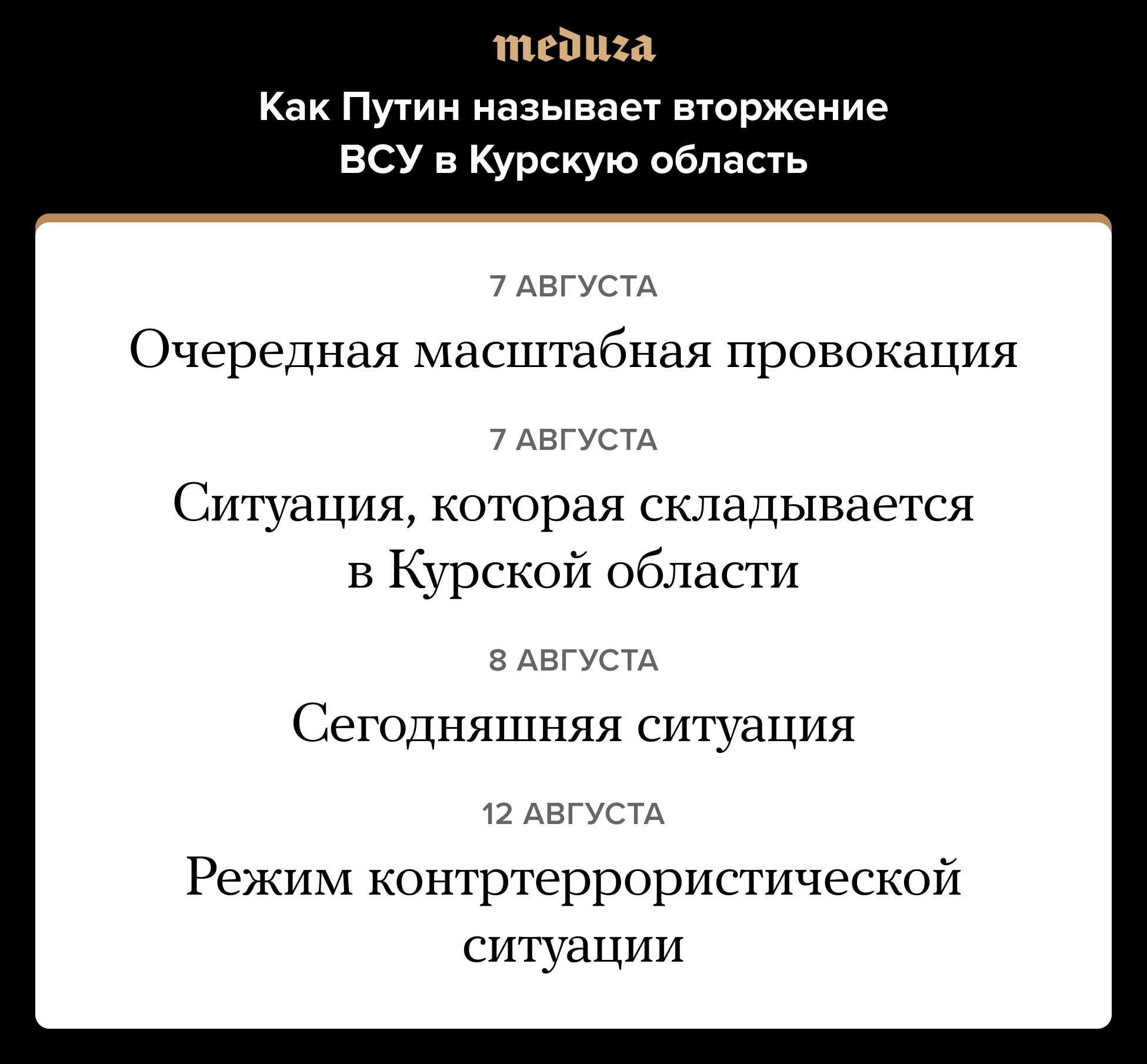 - Глава Курской области Алексей Смирнов на совещании с Владимиром Путиным сообщил, что ВСУ контролируют 28 населенных пунктов в регионе. В то же время украинский OSINT-проект DeepState утверждает, что ВСУ взяли под свой контроль около 44 населенных пунктов Курской области. По оценке «Медузы», украинская армия контролирует в регионе более 30 населенных пунктов. 10 августа «Медуза» подтвердила и показала на карте, что ВСУ заняли территорию Курской области на площади около 320 квадратных километров.