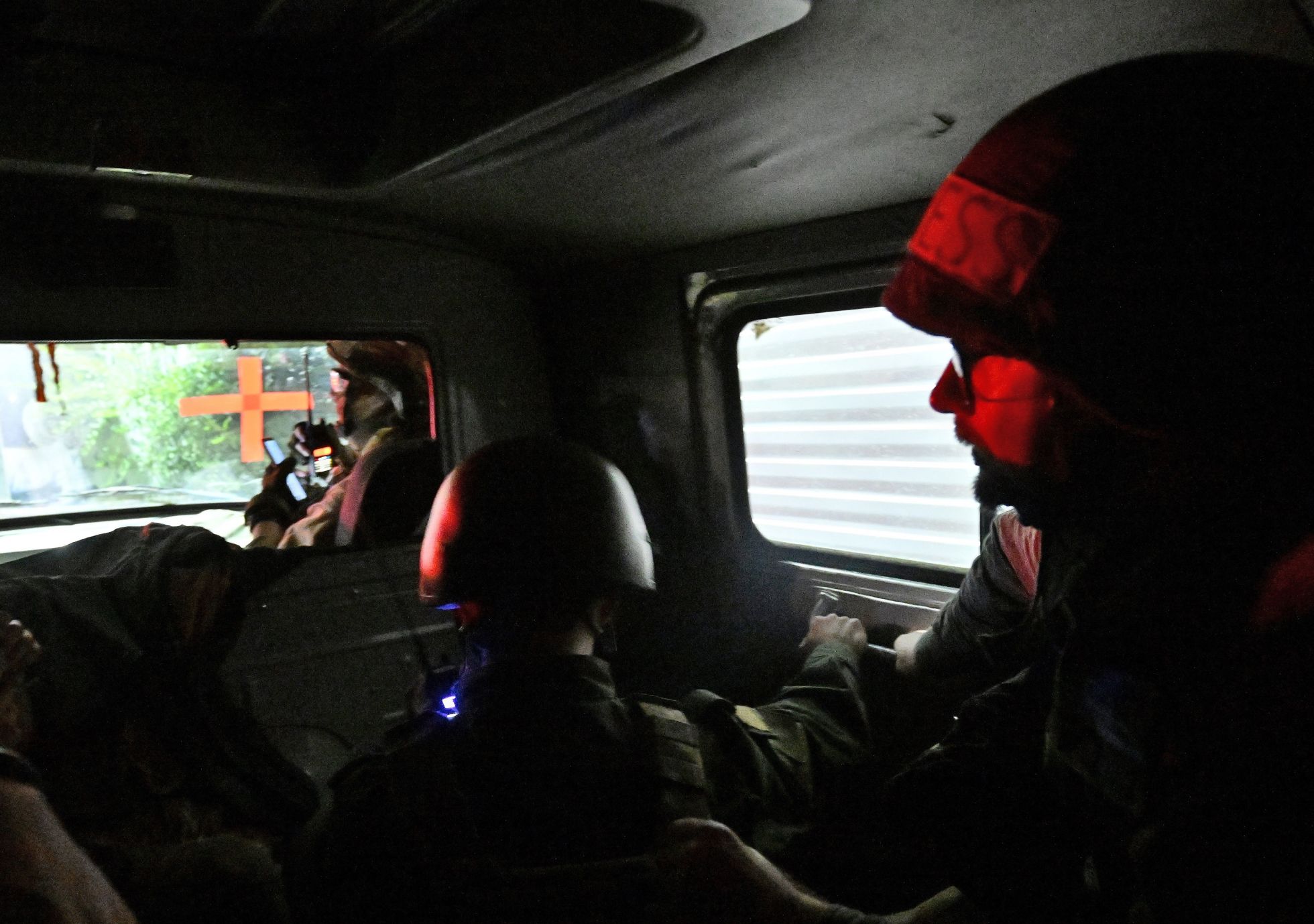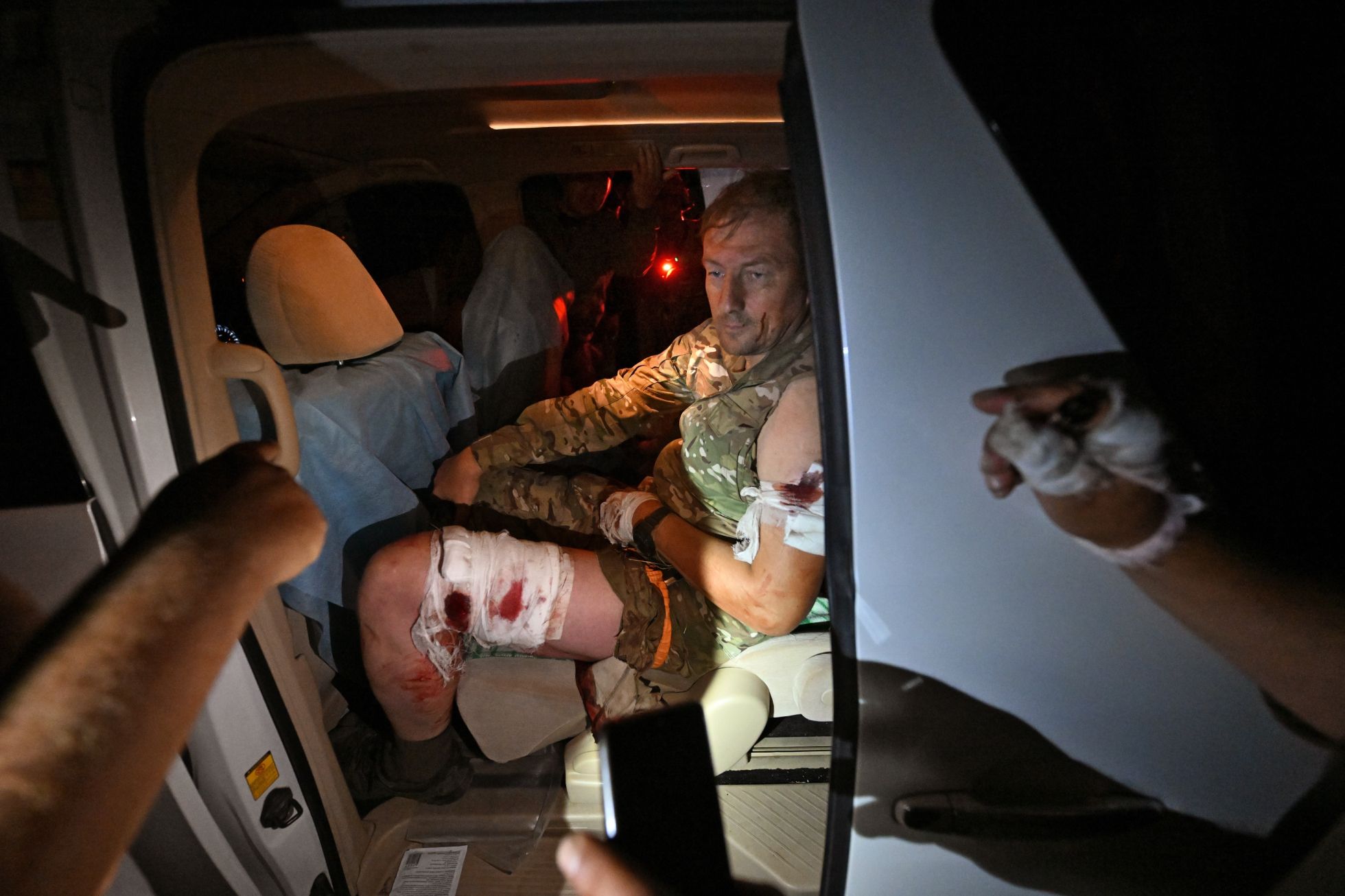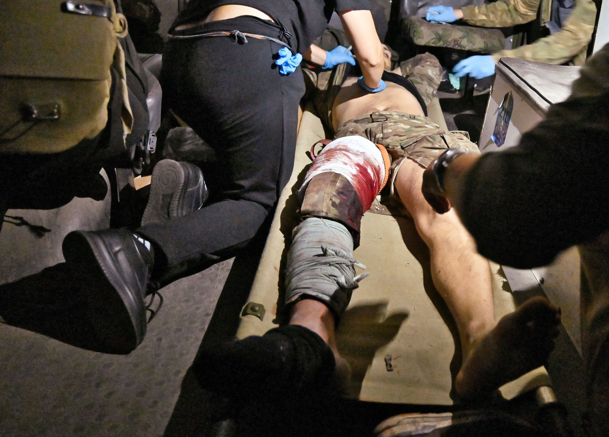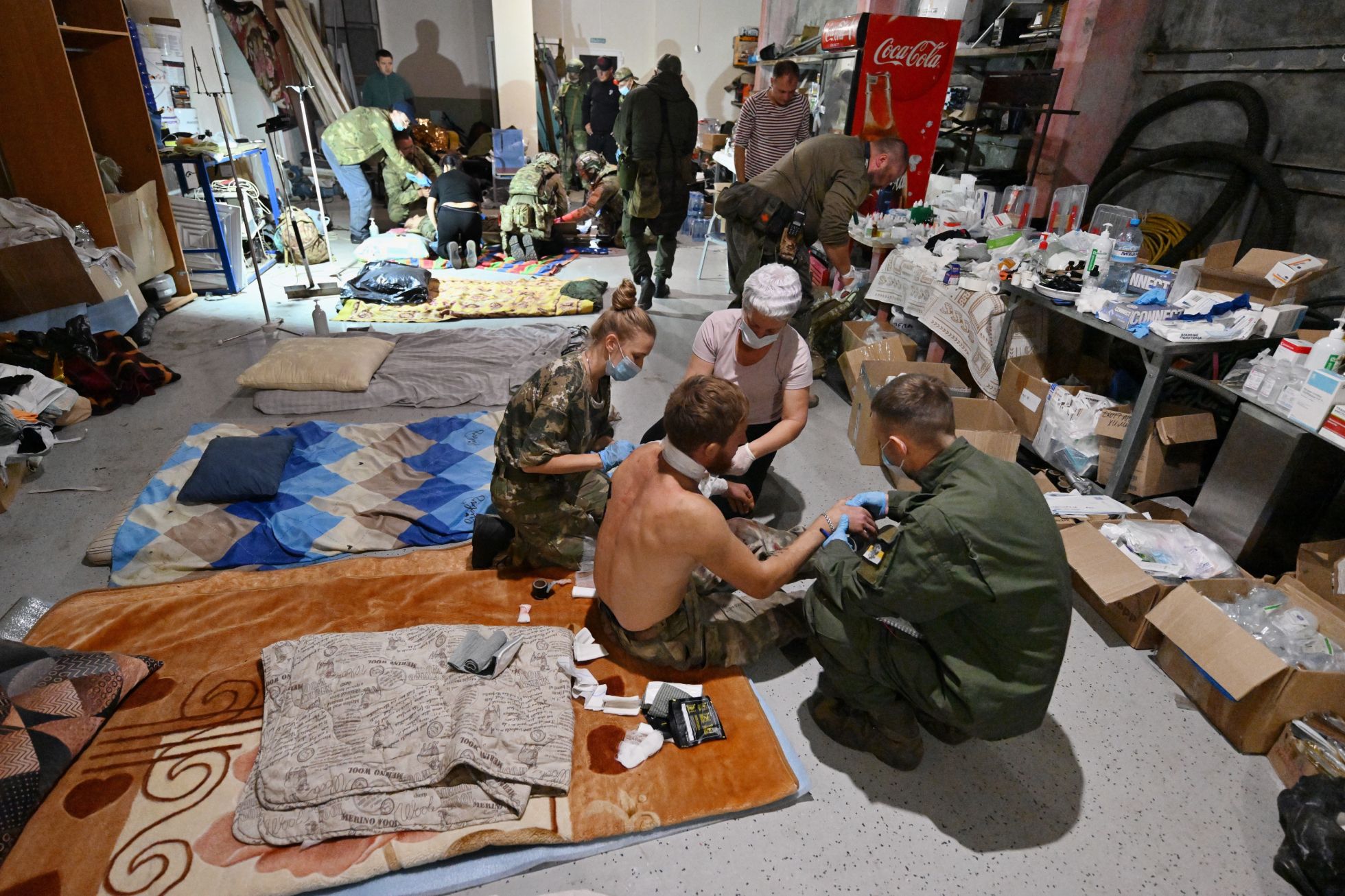 Пострадавшим военным пытаются помочь в полевом медпункте. Фотографии