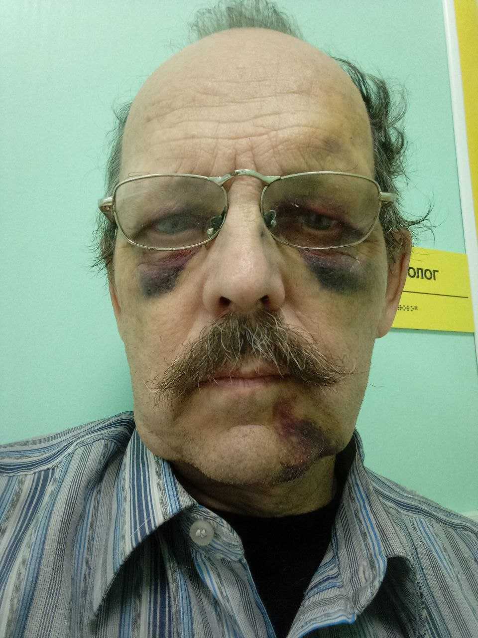 — Первый раз он меня капитально дубасил 13 апреля. Я падал два раза около своей двери. Я тогда только банки сдал, приехал домой — и он выходит, перчаточки надел и давай меня метелить: «Ты опять мусор тащишь!» Жена [его тоже кричит]: «Он грязь тащит!»