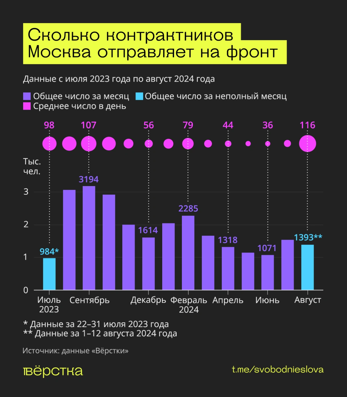 «Статистику по дням начали вести только в конце июля 2023 года, и это уже было начало спада потока, — говорит источник „Вёрстки“ в московской мэрии. — Если условно зимой-весной прошлого года контракты подписывали по 130 – 140 кандидатов, к лету уже до сотни откатилось число».