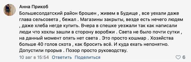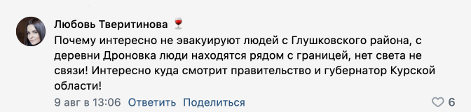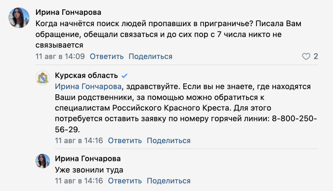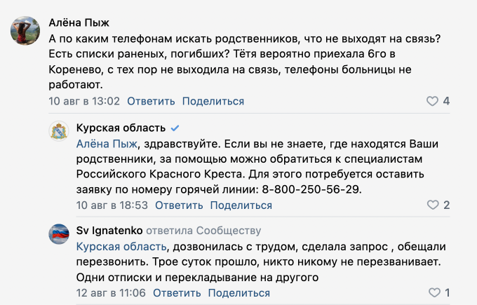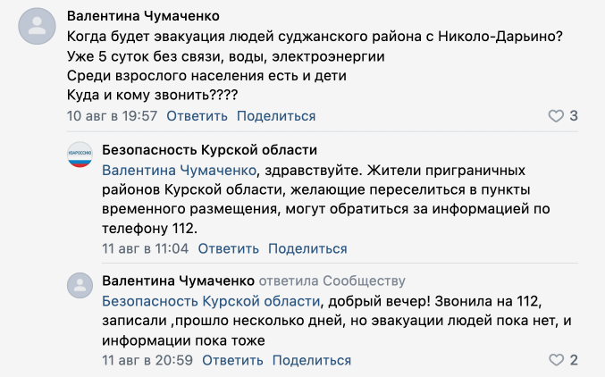 При этом очевидцы сообщили РБК, что в первые дни после начала операции ВСУ системной эвакуации из отдаленных сел и деревень не было. «Всех нас бросили», — говорила о первых днях после начала боев в Курской области жительница Кореневского района. Она рассказала, что вместе с другими людьми пришла на вокзал, где, как им сказали, должен был ждать поезд, однако он уже ушел, о чем их никто не предупредил. В произошедшем она винила главу района. «Наша глава [района] сволочь, скотина самая настоящая. Куда она делась, мы не знаем. Идиотка», — говорила жительница Кореневского района, которую в итоге все же эвакуировали в Курск на автобусе, но без вещей и денег.