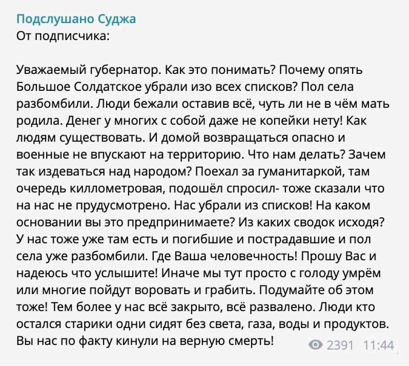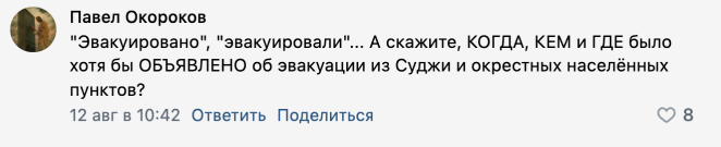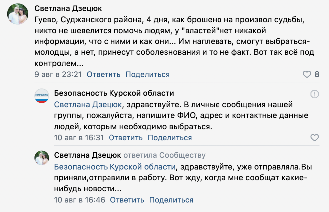 Житель Суджи Олег, который в первые дни операции ВСУ смог самостоятельно уехать из города, также рассказал «Медиазоне», что централизованной эвакуации не было. «Это у меня машина есть. Я прыгнул, уехал. А если у человека нет машины, куда он уедет, куда он побежит? Никакой информации от администрации нет вообще: что происходит, куда бежать, в какую сторону? Или сидеть в погребе?» — говорил он. Олег и другие собеседники издания рассказали, что в городе остались их родные и близкие, связи с которыми у них на момент публикации не было. Врио главы Курской области 12 августа говорил, что власти не знают о судьбе около двух тысяч человек, которые находятся в подконтрольных ВСУ населенных пунктах Курской области. Суджа — один из таких населенных пунктов.