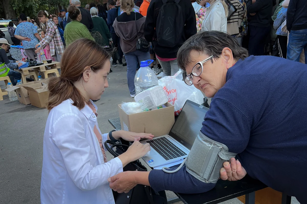 «Товарищи! Кто хочет пить?» — кричит толпе беженцев парень в зеленой жилетке. Он идет к людям с упаковкой из шести полуторалитровых бутылок. Через 10 секунд воды у молодого человека не остается. Он обещает тем, кому сейчас ее не хватило, скоро принести новую партию. В этот момент к столику медпомощи, за которым сидит молодая рыжеволосая девушка в белом халате, подходит пожилая женщина. Она садится за стол и протягивает девушке руку, чтобы померить давление. «Коля, привет!» — слышится в толпе женский голос. Похоже на то, что случайно встретились старые знакомые.