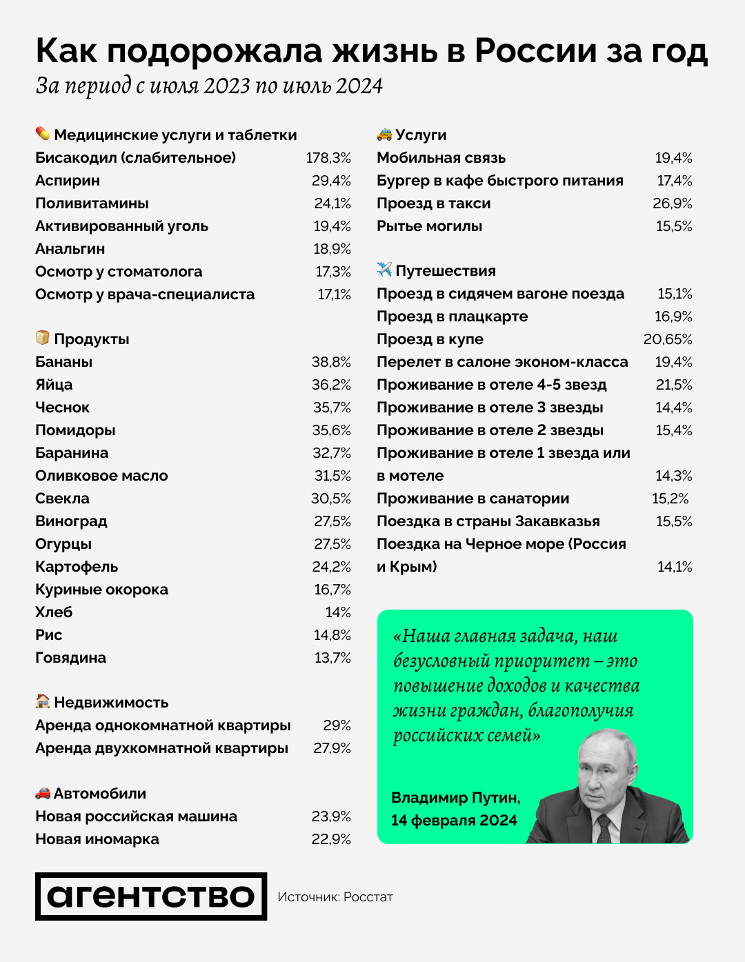 - Это станет дополнительной нагрузкой для россиян. Цены на многие продукты и услуги уже выросли за последний год, следует из анализа «Агентства». Некоторые таблетки и медицинские услуги подорожали на сотни (Бисакодил) и десятки (Аспирин, поливитамины) процентов. Выросли цены и на продукты (на помидоры — 35,6%, на огурцы — 27,5%, на картофель — 24,2%, на рис — 14,8%), и на аренду квартир (на 27,9-29%), и на путешествия. Подробнее — в инфографике.
