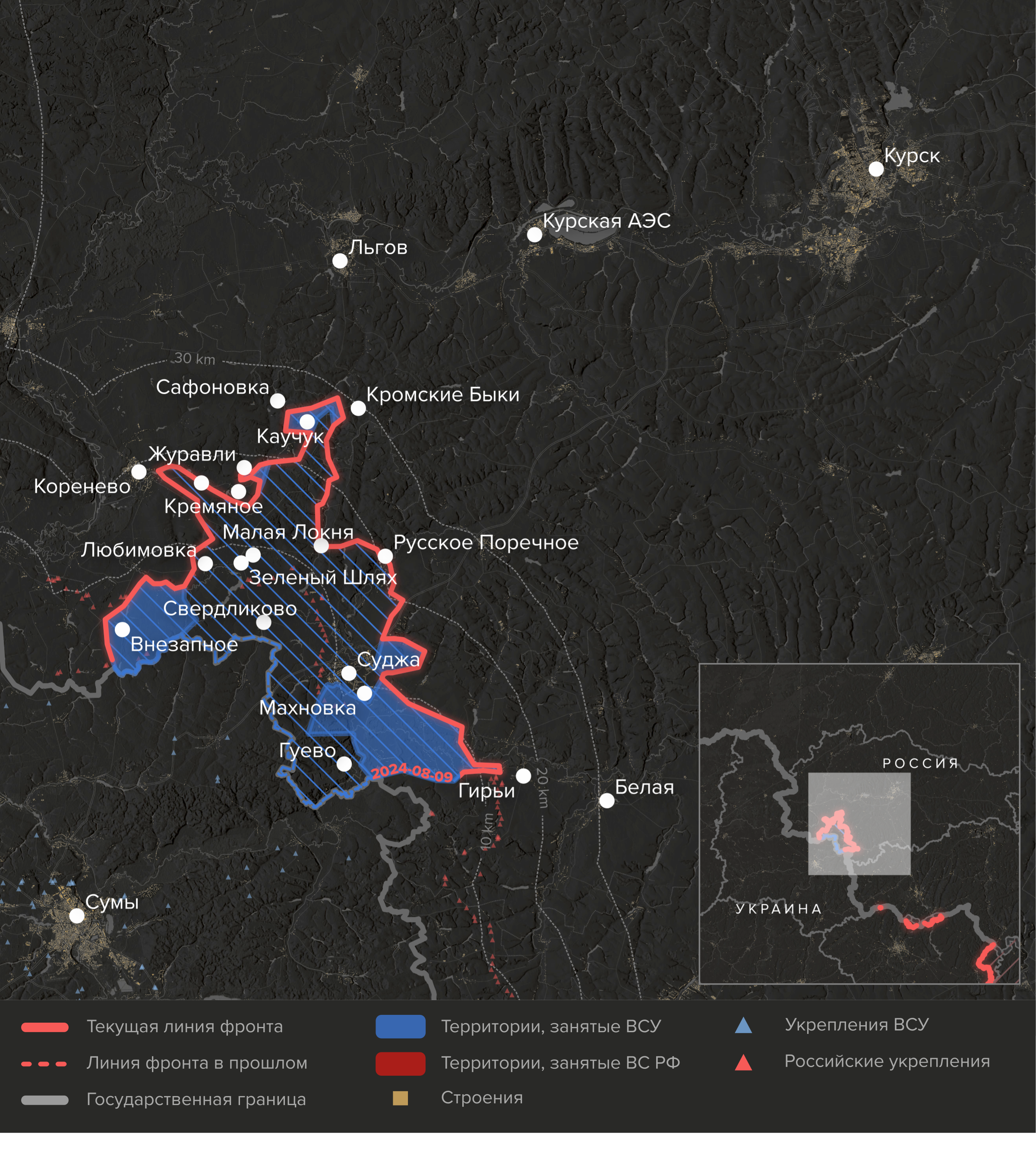• Еще один удар планировался к востоку от Суджи — с целью расширения плацдарма и создания надежного фланга для наступления на Льгов. ВСУ не смогли пробиться к райцентру Белая, понесли потери в технике, а потому заняли оборону у реки Псел в районе сел Спальное и Камышное.