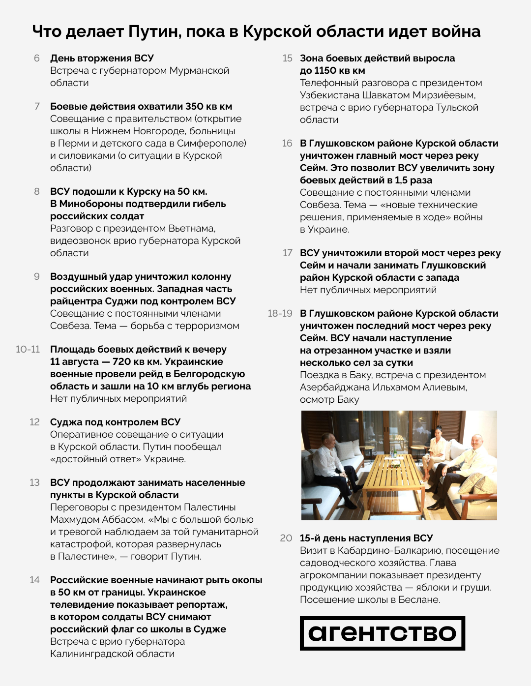 - Сам Путин ведет себя так, будто бы ничего серьезного не происходит. Он не говорил ничего о вторжении в Курскую область с 12 августа. А в воскресенье и понедельник российский президент посещал Азербайджан, где встречался с азербайджанским президентом Ильхамом Алиевым без пиджака и в рубашке с расстегнутыми верхними пуговицами.