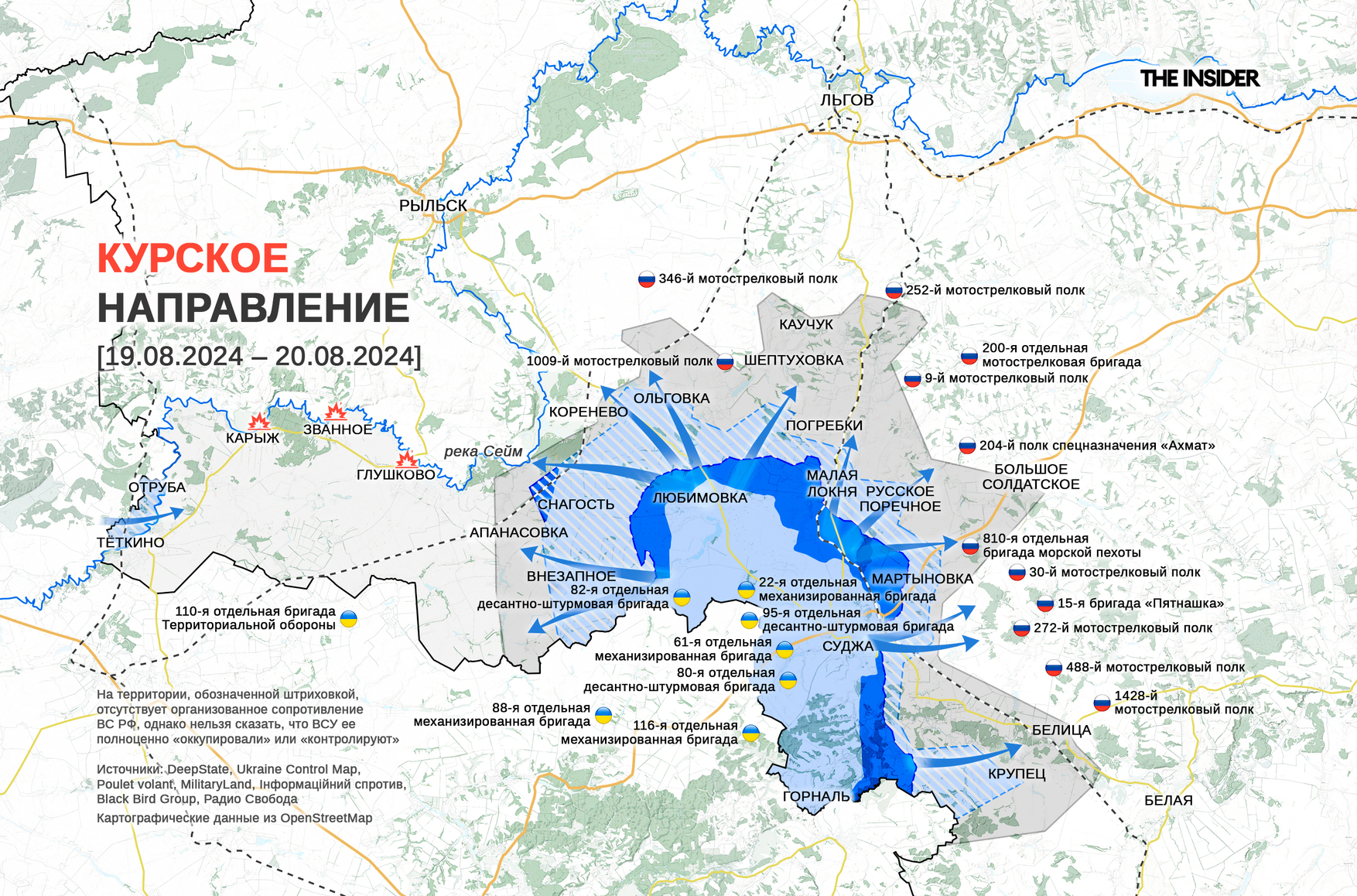 Издание «Новая Газета Европа» обобщает информацию о составе российских сил и средств в Курской области, в том числе переброшенных с других направлений. Помимо уже известных частей вроде 810-й ОБрМП, в материале среди прочего рассказывается об именном подразделении «Кулибин» из Нижегородской области и отрядах БАРС. Ресурс Poulet volant публикует карту с перечнем привлеченных на курское направление подразделений с указанием, откуда их перевели.