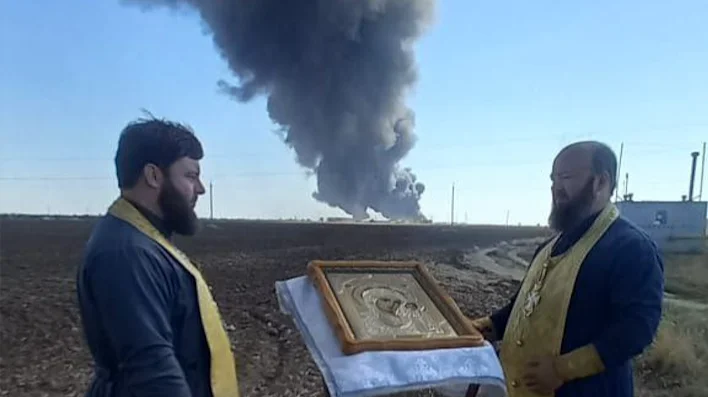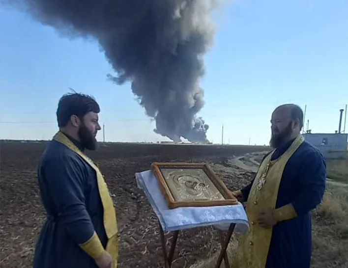 The Russian Orthodox Church has dispatched a group of priests to hold a prayer service in a field adjacent to an oil depot in southern Russia’s Rostov region where a fire has been raging for four days following a Ukrainian drone strike on the facility, the Volgodonsky Eparchiate said on Tuesday.