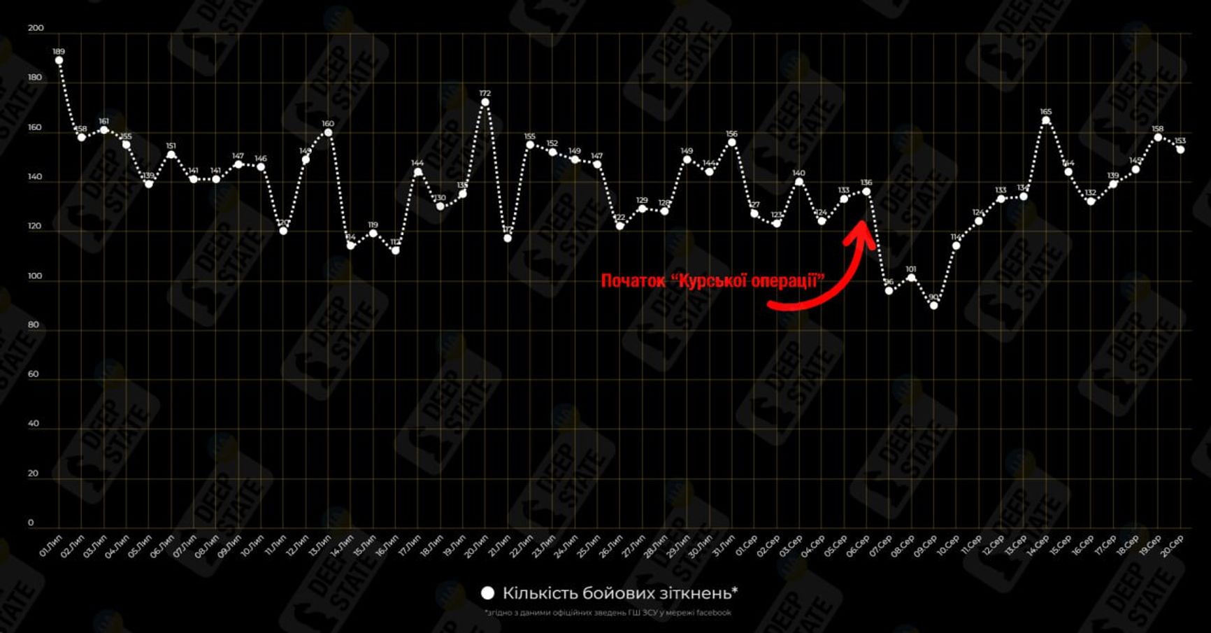 Операция в Курской области, судя по данным Генштаба ВСУ, обобщенным проектом DeepState, не слишком повлияла на число российских атак на фронте. В начале операции фиксировался определенный спад активности, однако уже через неделю показатели вернулись на прежний уровень.