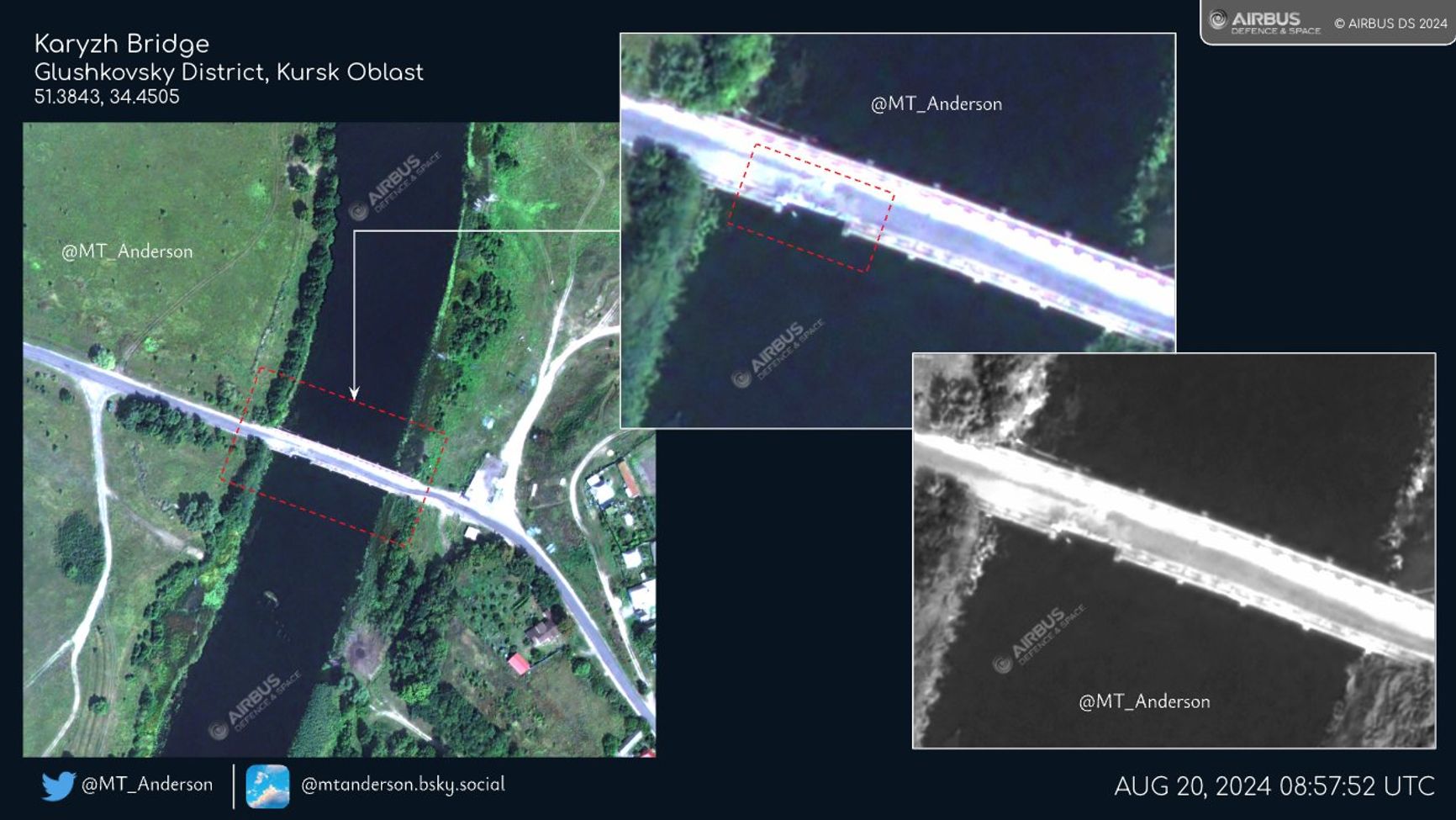 Согласно геолокации канала «△ Dnipro | OSINT з Гарбузом», удары были нанесены в районе обеих переправ, обнаруженных ранее на спутниковых снимках. В то же время, согласно снимку от 21 августа, один из мостов снова находился на том же месте. Кроме того, исследователь под ником MT Anderson пишет, что мост в Карыже не уничтожен, а поврежден, но проехать по нему тяжелой технике будет проблематично.