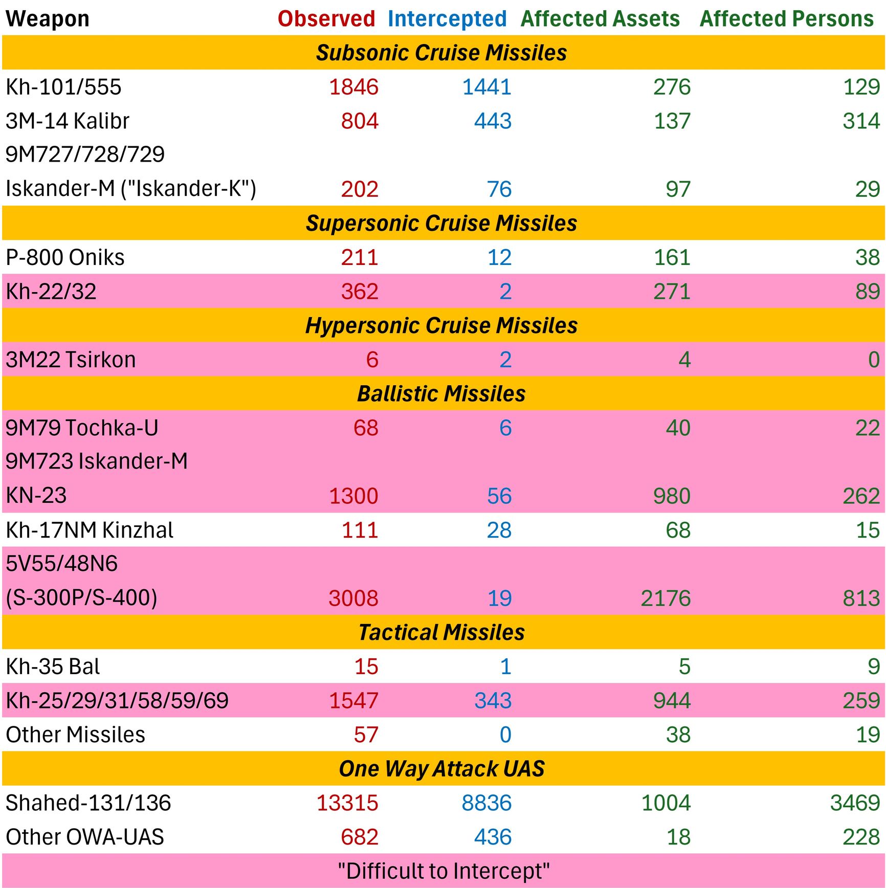 Александр Сырский представил статистику перехватов российских ракет и дронов с февраля 2022 года. Согласно этой информации, ВС РФ запустили в ходе войны почти 14 тысяч беспилотников, в основном типов «Шахед» и «Ланцет», 9 272 из них удалось сбить. Из 9 627 ракет перехвачены 2 429.