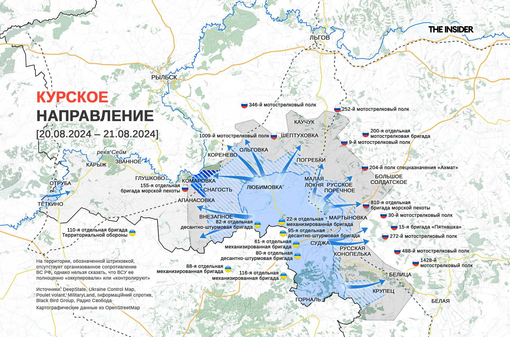 Русская служба Би-би-си обратила внимание, что операция в Курской области наконец-то появилась в сводках от Генштаба ВСУ — но пока просто в виде упоминаний, без подробностей. Украинский военнослужащий, ведущий Telegram-канала «Офіцер ✙», сообщает со ссылкой на участника курской операции о снижении темпов наступления. «Военкор» Юрий Котенок и вовсе увидел в действиях ВСУ на этом участке признаки перехода к позиционной войне, хотя интенсивность боевых действий остается высокой: